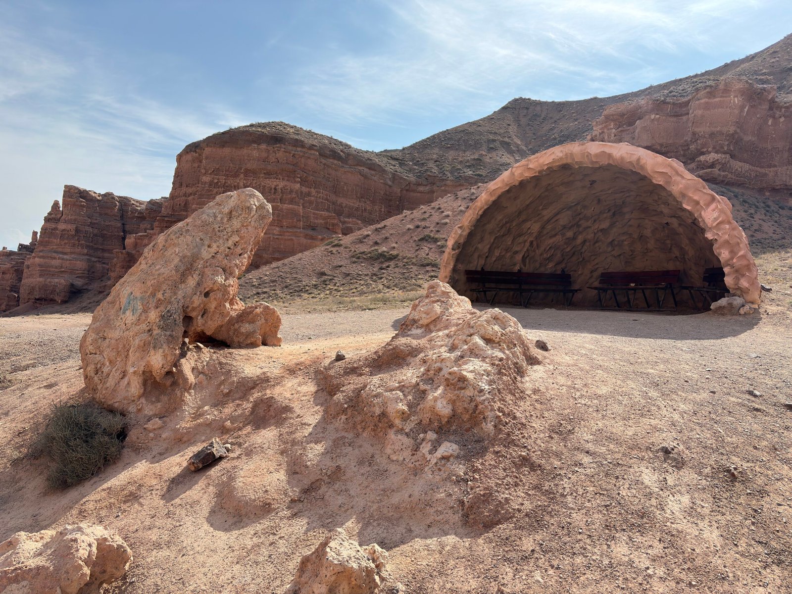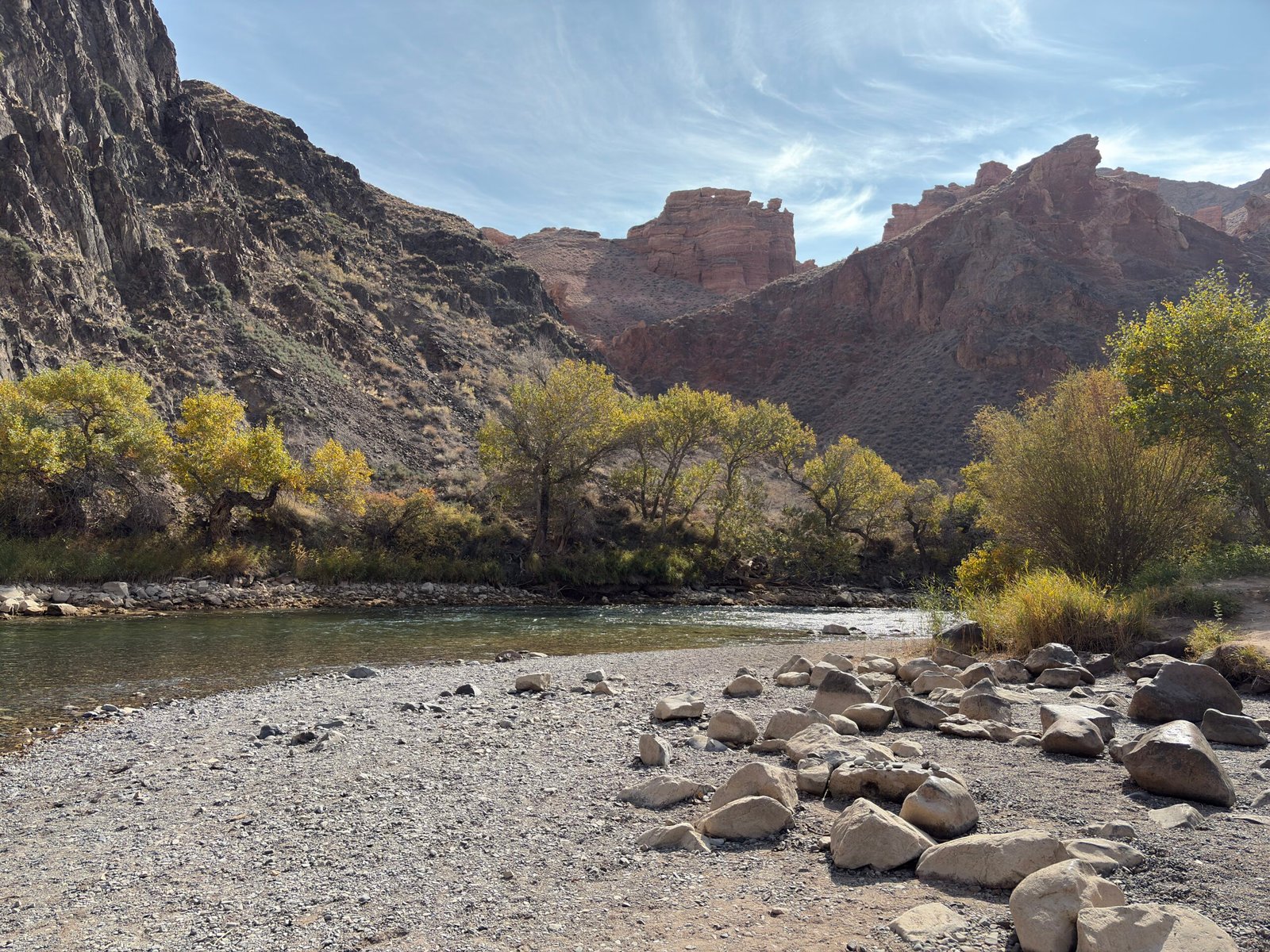 After a delightful walk, we arrived at the tranquil banks of the Charyn River which offered a tranquil oasis amidst the arid mountain landscape. Sitting by the river, we were serenaded by the gentle flow of water and the sweet chirping of birds. This peaceful ambiance was the perfect spot to unwind and recharge. We spent a blissful half hour soaking in the beauty of nature before boarding a marshrutka back to the staircase and climbed up to the visitor centre.